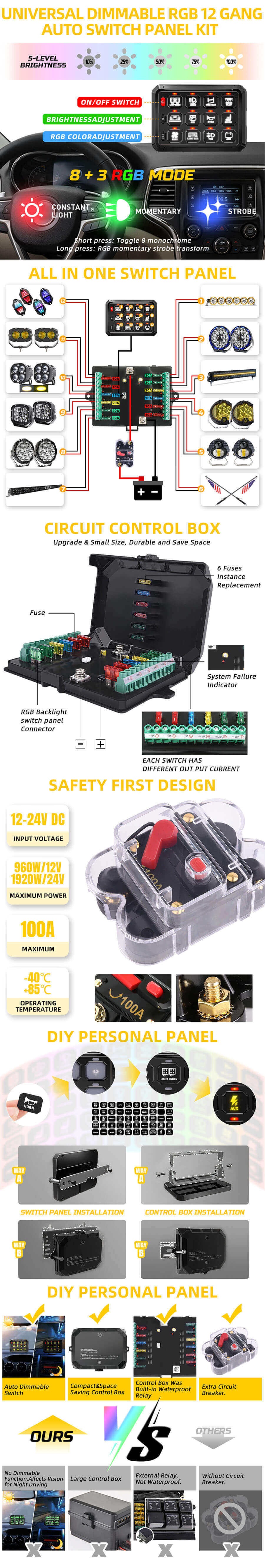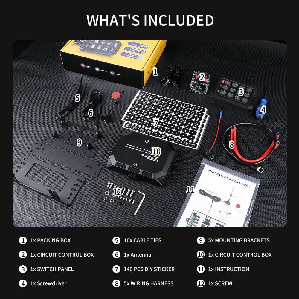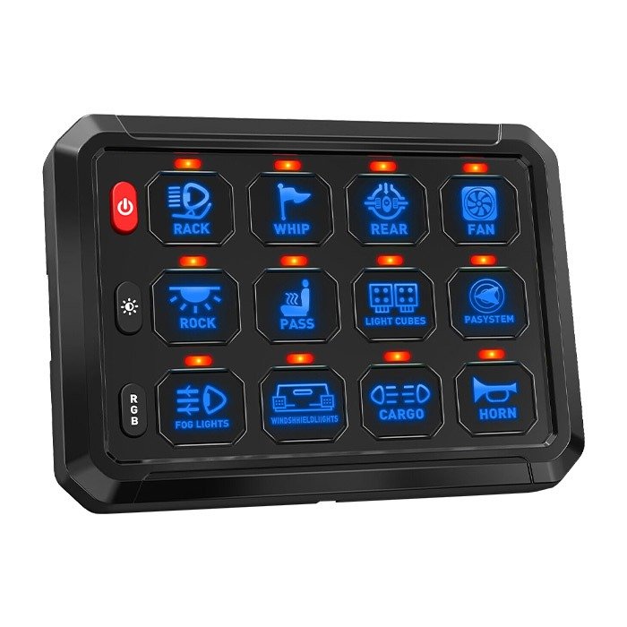 این محصول برای خودروهایی که به چندین دستگاه برقی پرمصرف نیاز دارند ایدهآل است. میتوان چراغهای لایت بار، چراغهای RGB، پروژکتور، فن، پمپ آب، کمپرسور باد، وینچ و سایر تجهیزات را تنها با یک پنل کنترل کرد و نیازی به چندین کلید و رله جداگانه نیست.