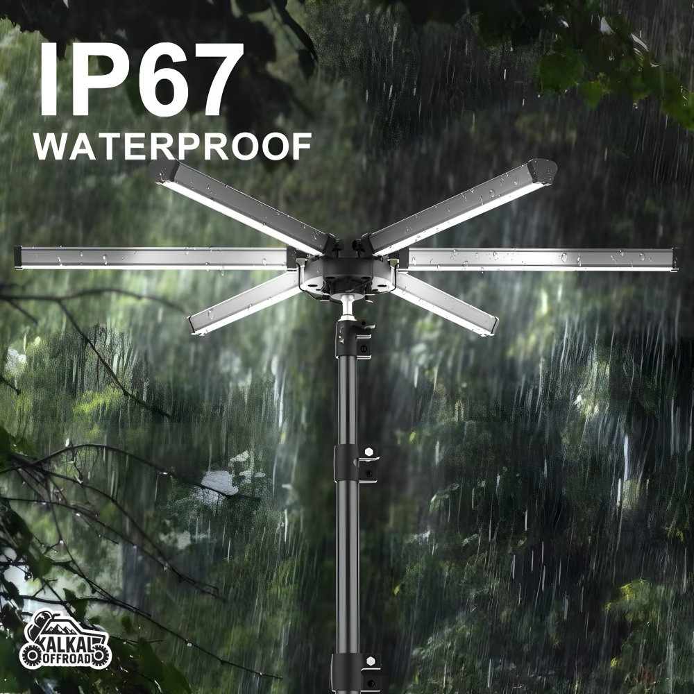 نور این چراغ در ارتفاع بالا (مثلاً روی سقف ماشین یا وسط کمپ) بهخوبی پخش شده و تمام اطراف را روشن میکند. بدنهی مقاوم از آلیاژ آلومینیوم سبک و ضدزنگ ساخته شده و به لطف استاندارد IP67 در برابر آب و گردوغبار کاملاً مقاوم است.