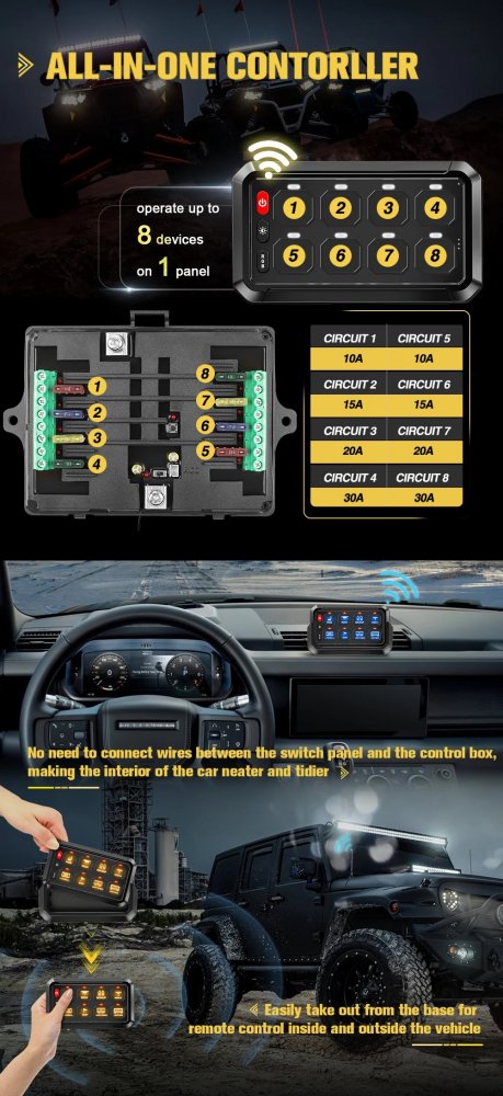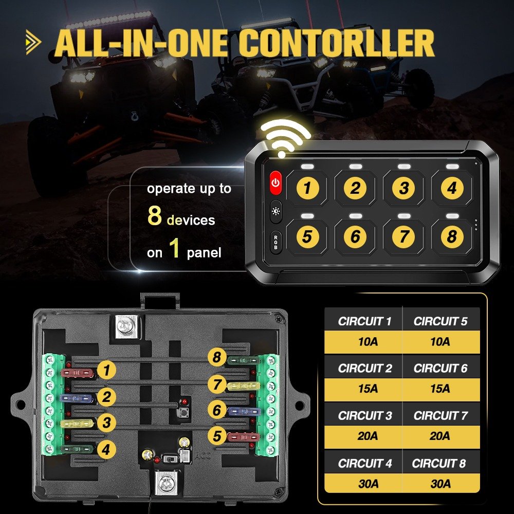 این محصول برای کسانی که تجهیزات برقی متعددی روی خودرو یا کمپر خود دارند ایدهآل است و میتوان چراغهای لایت بار، چراغهای LED، چراغهای مهشکن، پروژکتور، فن، پمپ آب و سایر تجهیزات برقی را تنها با یک پنل کنترل کرد.